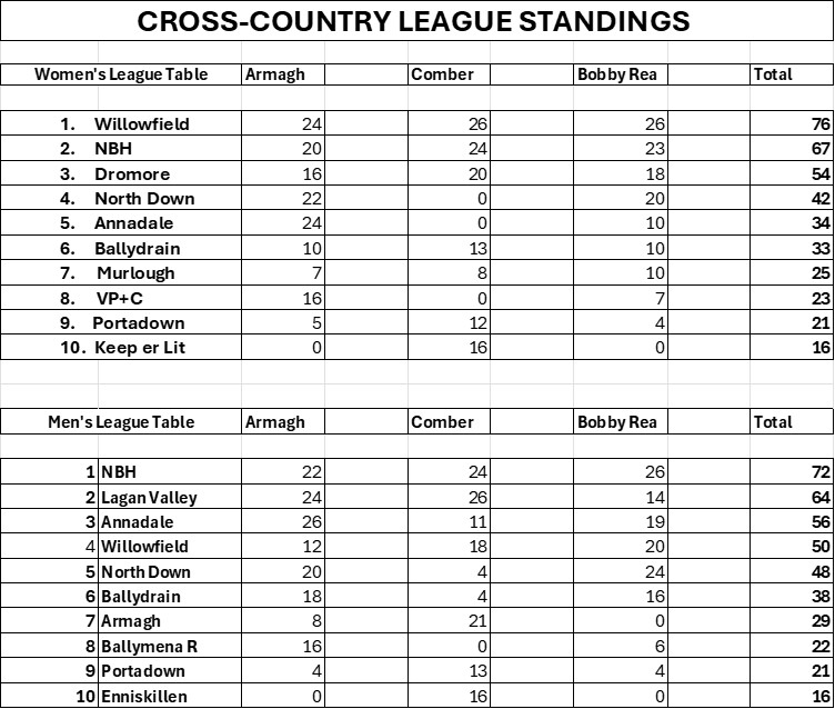 The League tables for this year's Cross Country League after 3 rounds (TJ McElmeel XC, Comber Cup and Bobby Rea XC) are as follows: